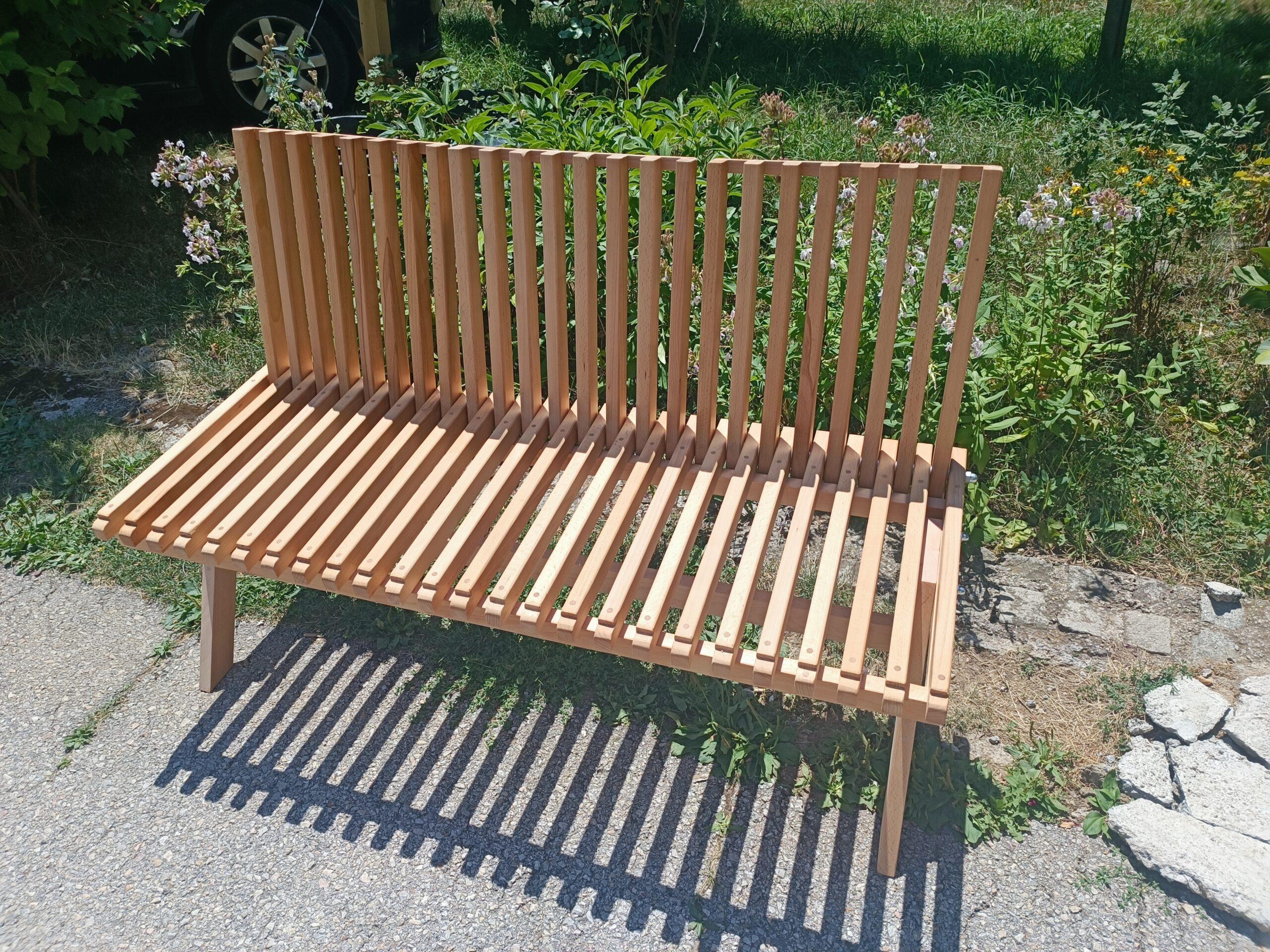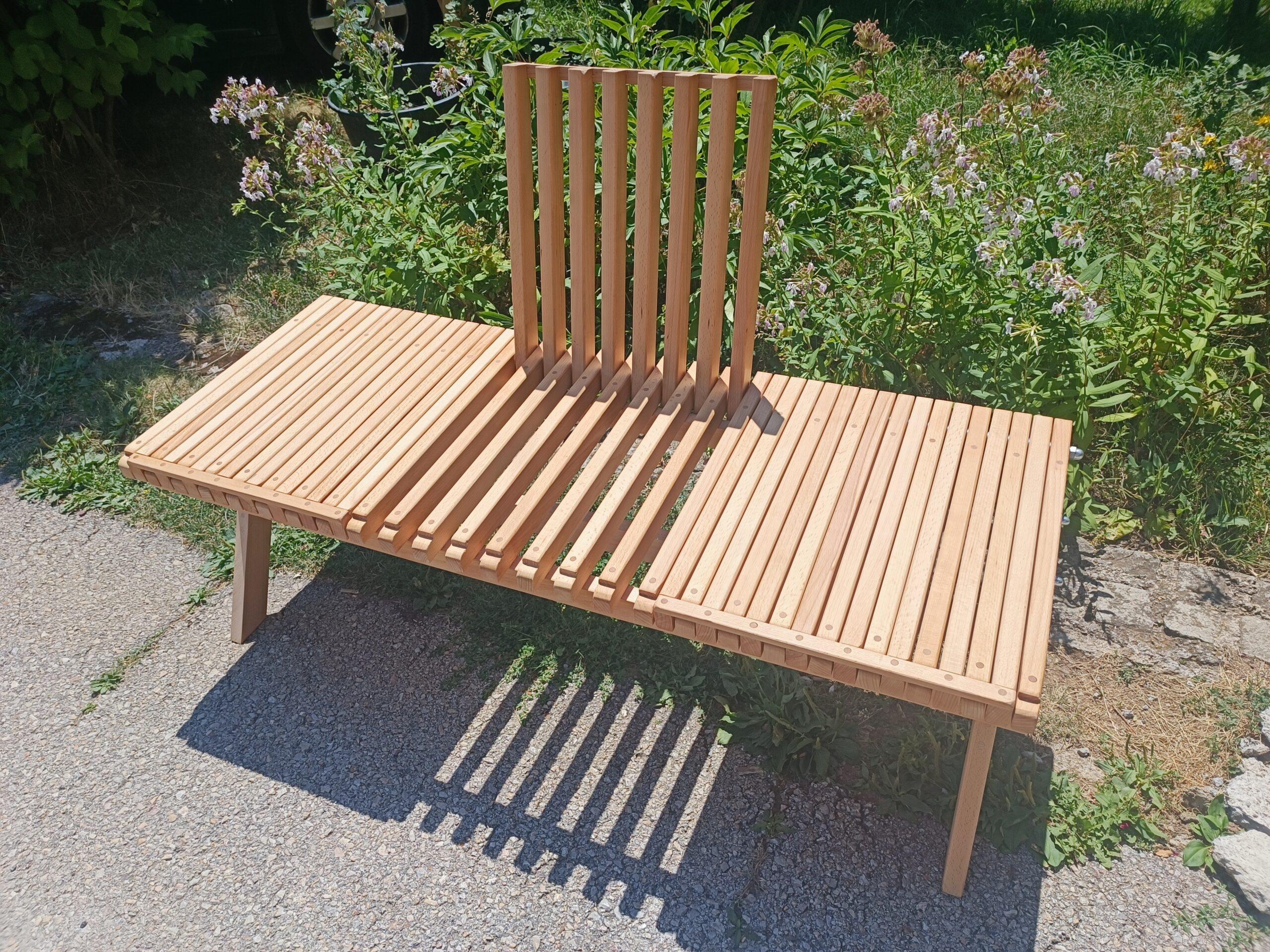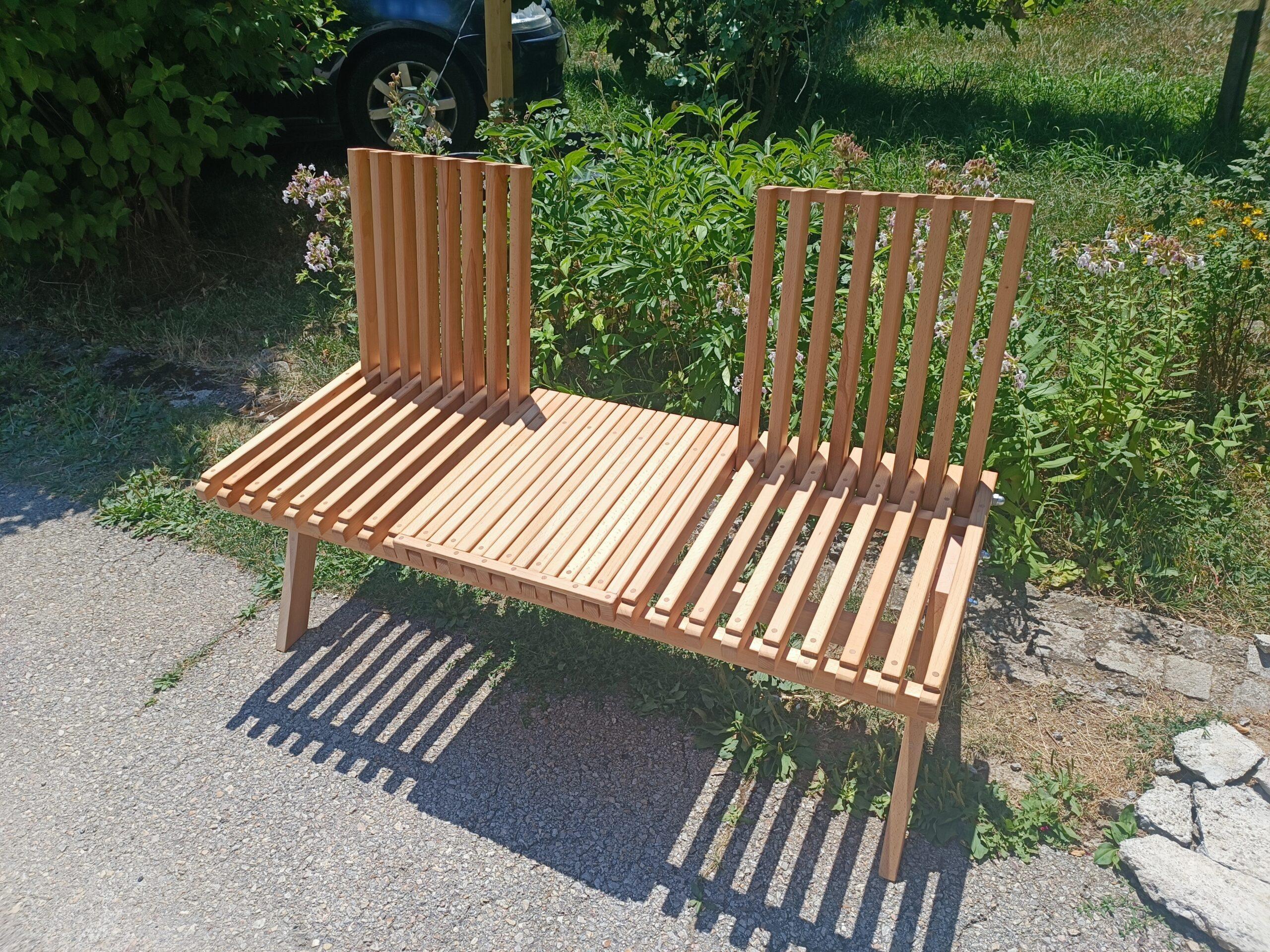 Neobična klupa-dvosed izrađena od bukovog drveta. Zbog modularnog naslona može da bude klupa, dvosed sa stočićem ili trosed.